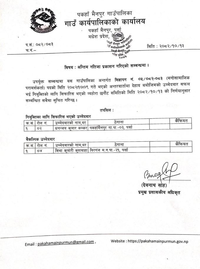 अन्तिम नतिजा प्रकाशन गरिएको सम्बन्धमा।