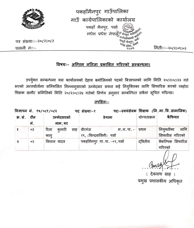 अन्तिम नतिजा प्रकाशित गरिएको