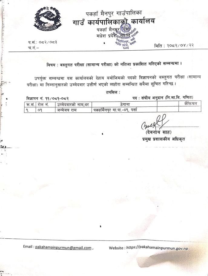 बस्तुगत (सामान्य परिक्षा) को नतिजा प्रकाशन गरिएको
