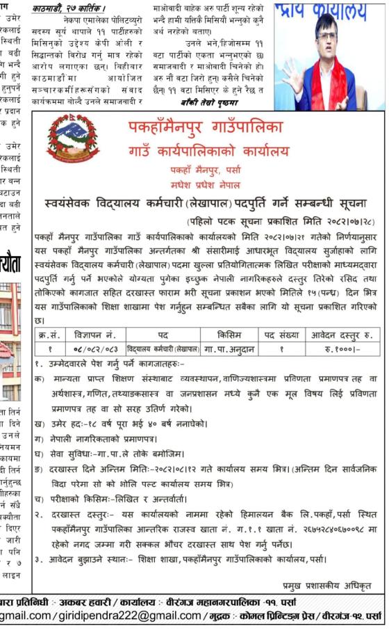 » स्वयंसेवक विद्यालय कर्मचारी (लेखापाल) पदपु्र्ती सम्बन्धी सूचना।