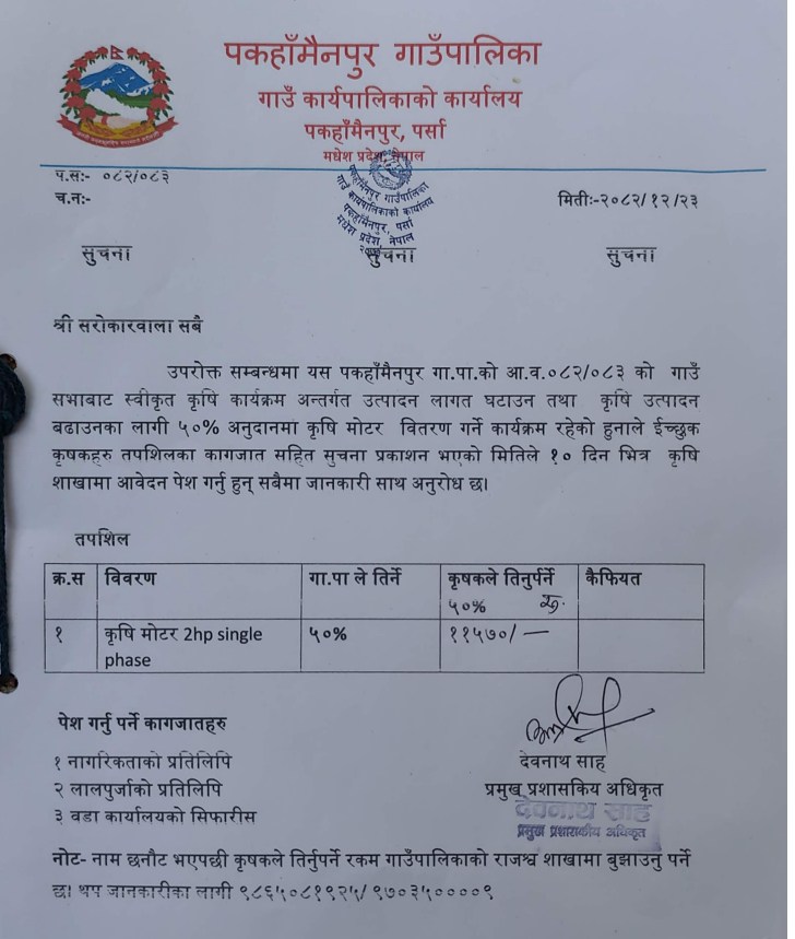 » ५०% अनुदानमा कृषि मोटर सम्बन्धि सूचना।
