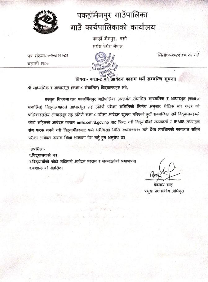 कक्षा ८ को आवेदन फारम भर्ने सम्बन्धि सूचना।