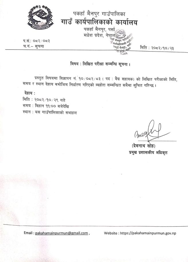लिखित परिक्षाको मिति र समय निर्धारण गरिएको सम्बन्धमा।